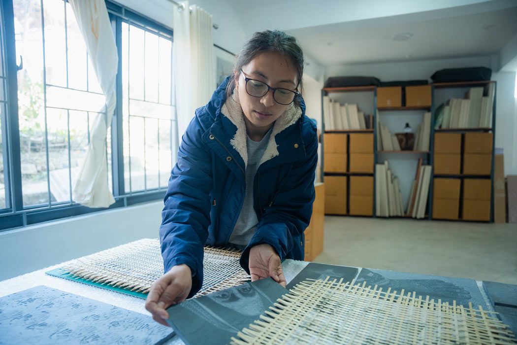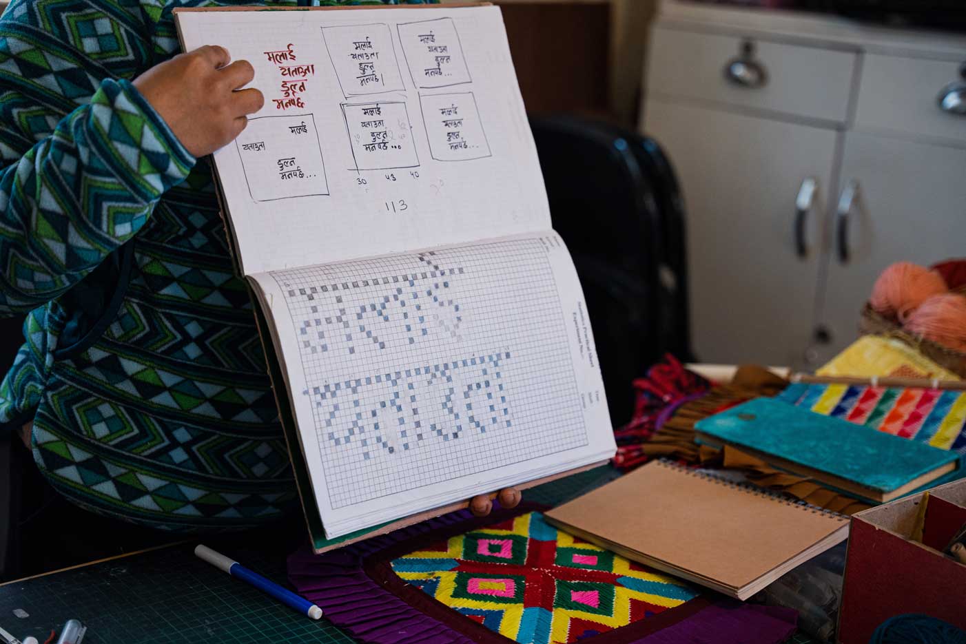 Their creative processes tell of struggle, but also amplify the ways in which local women act, resist, and endure intersecting structures of oppression through words, songs, rituals, and crafts. In meeting these women, the artists asked: Where and how do women tell their stories? What materials and spaces do they use? What is the role of creative activities in their homes and communities? Artists drew inspiration from stitching, embroidery, weaving with plant fiber, singing, murals, godna tattooing, stone engraving, tailoring with sewing machines, paper-making, and oral storytelling – forms often seen as practiced by women of specific castes or ethnicities, and within the domestic sphere, forms which are largely overlooked or undervalued.